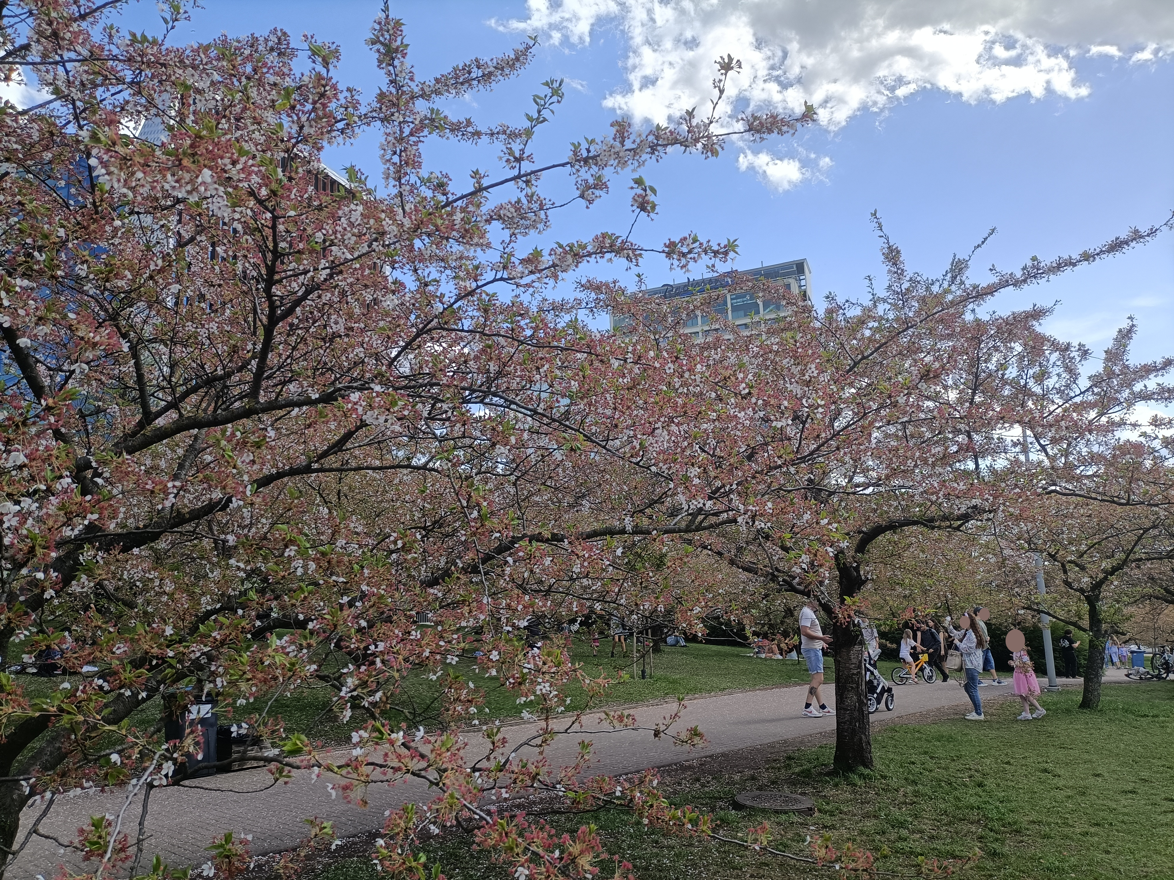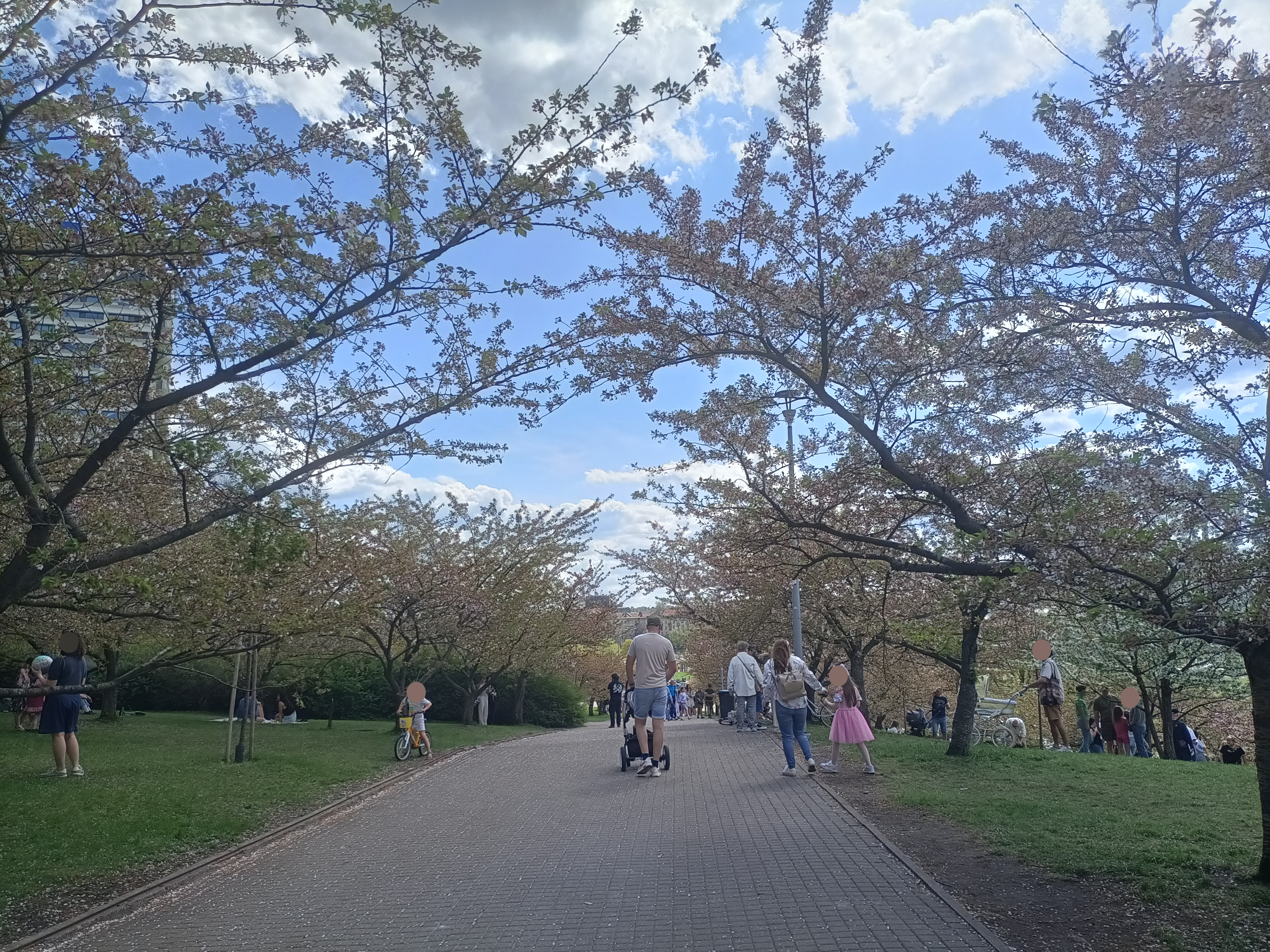 Mais la plus grande attraction au printemps reste la fleuraison des quelque 200 cerisiers du Japon (ou sakuras) présents. En fin de journée et le week-end, le monde se presse sous ces arbres, dont une partie semble avoir été replantée vu la taille chétive d’un certain nombre d’entre eux. Beaucoup prennent des photos et des selfies et s’attroupent près des arbres les plus fleuris. D’autres s’installent en dessous pour pique-niquer ou se reposer.