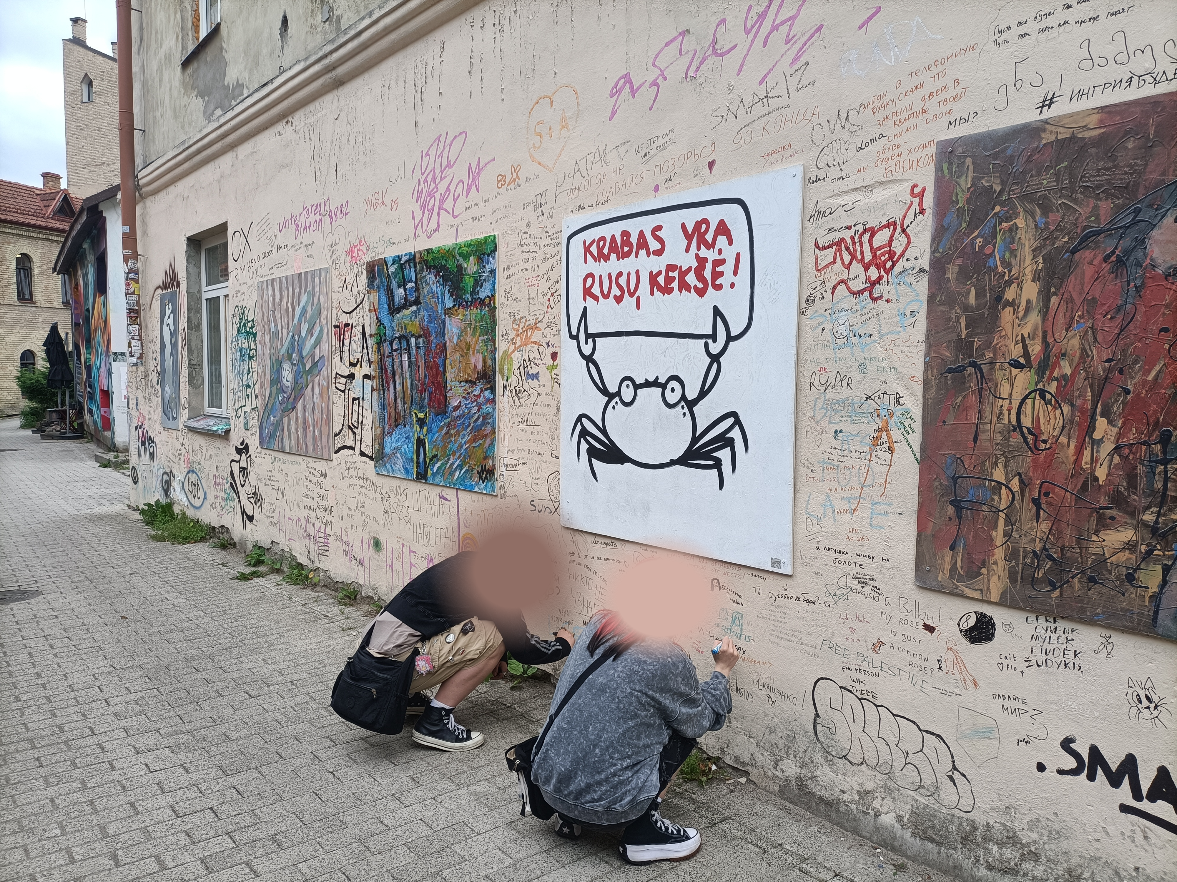 Le crabe est (a priori) un surnom qui désigne le maire de Kaunas et le slogan semble dénoncer les liens économiques du maire avec des entreprises russes après 2022. En effet, il posséderait des parts dans une entreprise à Kaliningrad, parts qu’il semble avoir vendu en 2024. Mais n’hésitez pas à m’apporter des précisions sur cette histoire (et ce slogan), car j’ai trouvé peu d’informations!